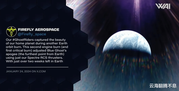 蓝色幽灵的进展尤其顺利。它现在已经完成了两次机动,利用在轨燃烧慢慢提升远地点,然后最终飞向月球。这次机动使它远离地球,并能够拍摄到像这样的精彩镜头。